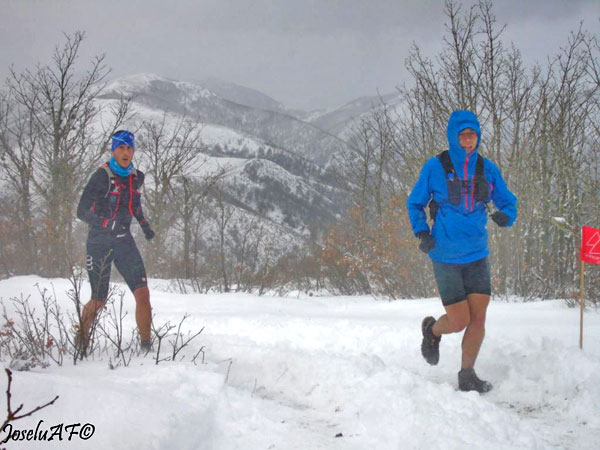 Pronto llegamos al primer avituallamiento que está a unos 1000 metros. La nevada ya es considerable. Yo me desvío unos metros de la carrera para entrar en él y recargar agua. Quiero estar bien hidratado para no pasarlo mal al final.